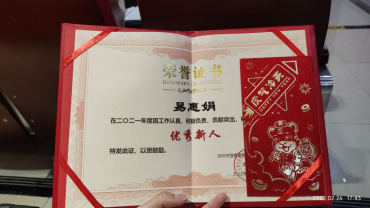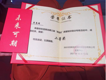 A:刚进亚辉龙,应届生集训宣誓成为奋斗者的那刻,我觉得挺有意义的。在工作期间也获得了一些荣誉,这些荣誉是我实现了个人价值的体现,觉得可以分享出来,想告诉大家,在工作中实现个人价值真的是一件很有成就感和满足感的事。