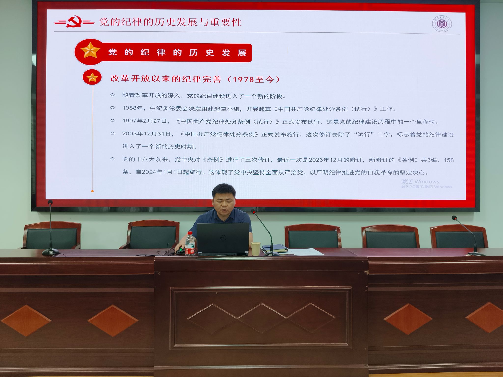 许建雄从党纪的历史发展及重要性、如何高质量开展党纪学习教育、典型案例是最好的“教科书”和努力做一名合格党员四个方面阐述了党纪在各个不同革命历史时期的主要内容,对党纪学习教育提出具体要求,并通过讲述党员夫妻何孟雄与缪伯英、雷锋、杨善洲、黄大年和于敏等优秀共产党员的先进事迹进一步明确成为一名合格党员的标准。他指出,党的十八大以来,党中央对《中国共产党纪律处分条例》(以下简称“《条例》”)进行了三次修订,最近一次是2023年12月的修订,新修订的《条例》共3编、158条,自2024年1月1日起施行。这体现了党中央坚持全面从严治党,以严明纪律推进党的自我革命的坚定决心。他强调,把党纪学习教育落到实处,必须深刻领悟“两个确立”的决定性意义,坚决做到“两个维护”,要切实把思想和行动统一到党中央决策部署上来,把遵守政治纪律和政治规矩落实到自己的全部工作和学习中,推动党纪学习教育取得实实在在的成效。他希望,全院师生党员能以党纪学习教育为契机,在思想理论上走前头,认真学习党的二十大精神和习近平新时代中国特色社会主义思想,多方面汲取营养,从小事做起,从本职工作做起,以实际成绩彰显党员的先进性。