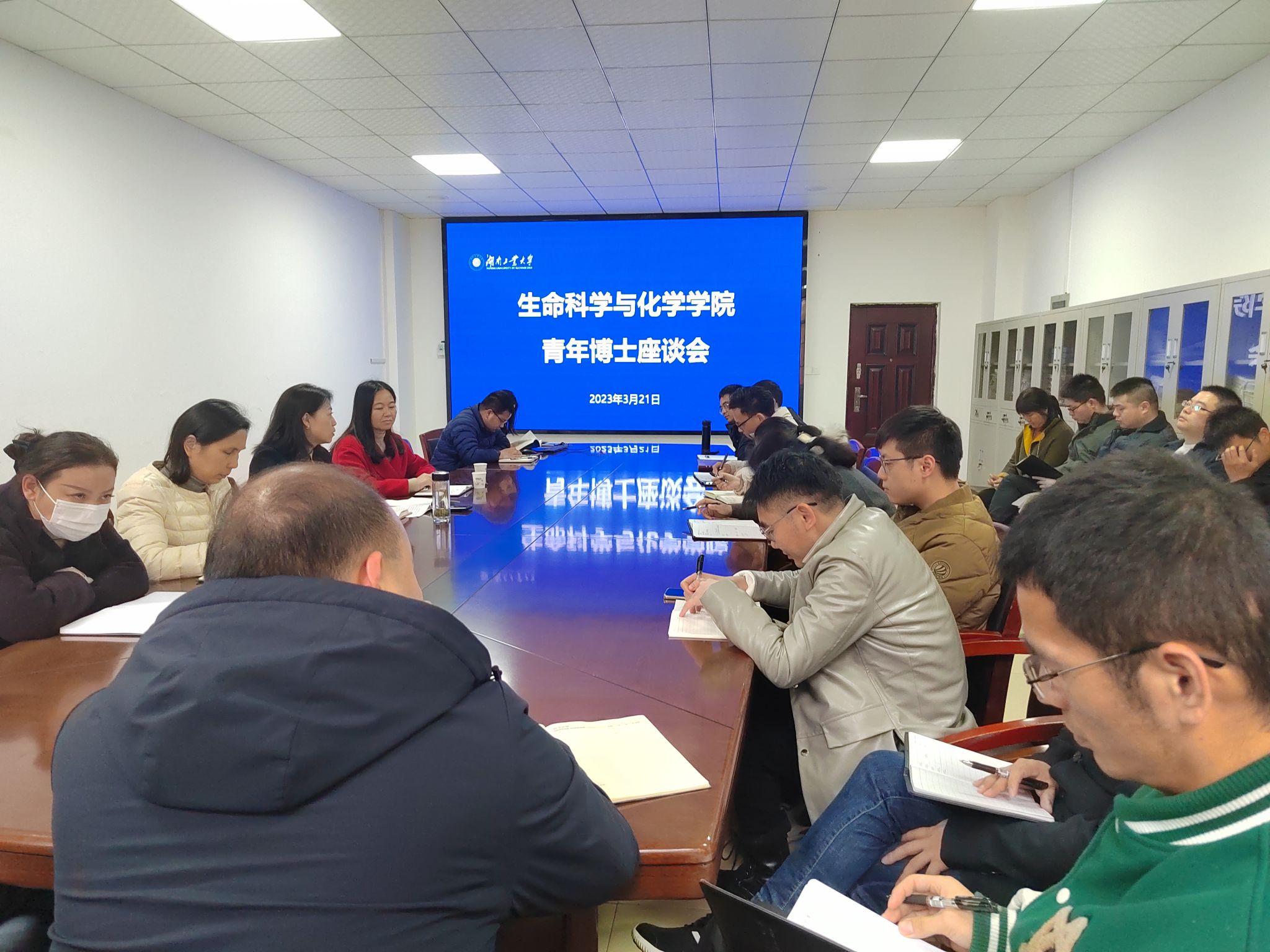 课后与会人员围绕干事创业生活等主要问题开展了座谈会,面对大家的问题,聂立波和曾晓希耐心给予回答。在座谈中,大家一方面肯定了学院在政策导向上培育教职工积极进取的激励作用,另一方面也提出了目前学校和学院在学科资源、科研环境、学术引领等不足的客观问题。个别博士结合个人实际情况针对某些具体问题分享了有效解决办法获得一致认可。