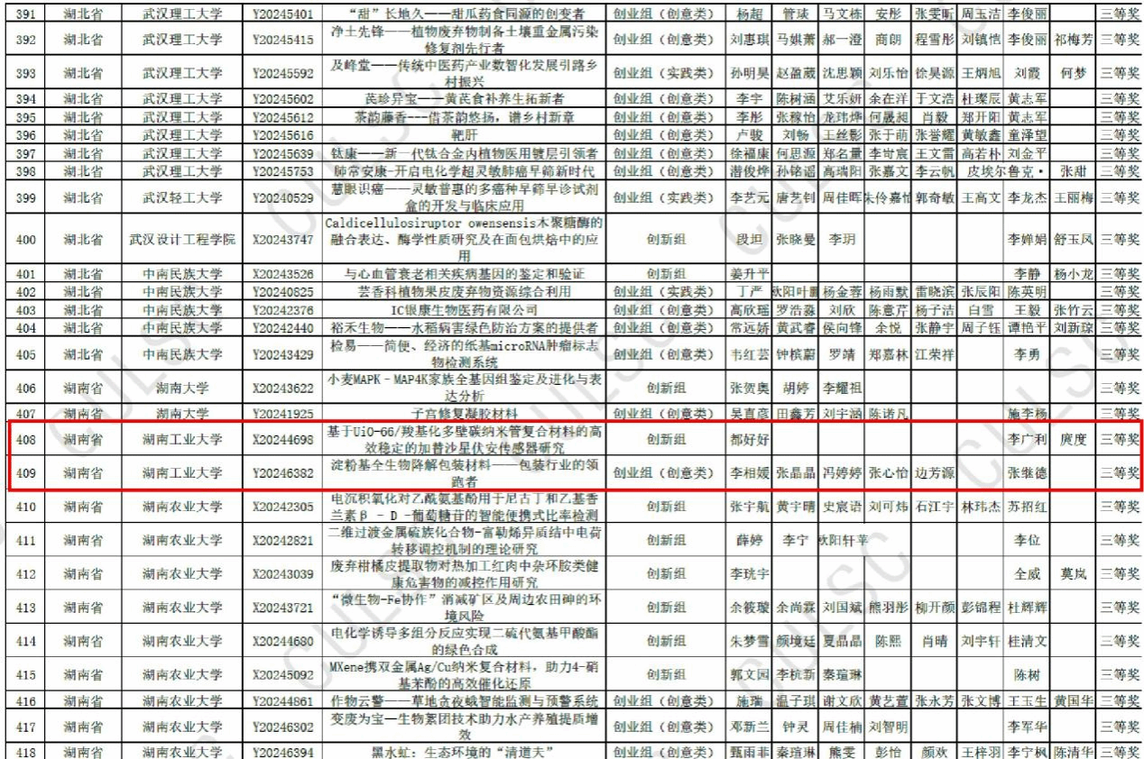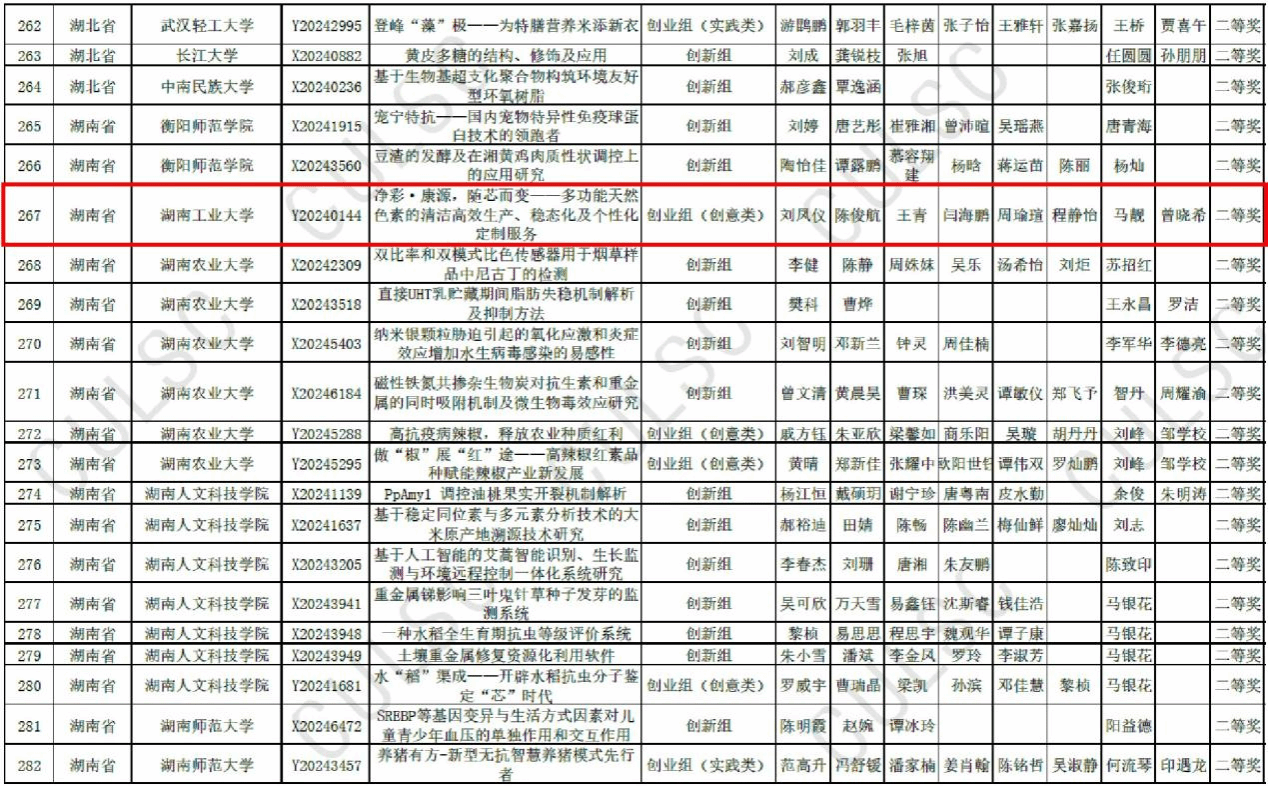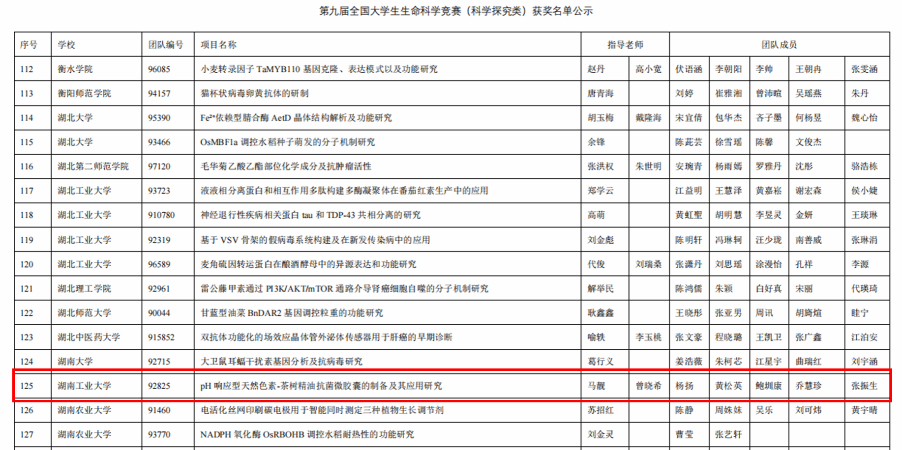 2024年7月23日,“舜宇”杯第九届全国大学生生命科学竞赛(科学探究类)全国总决赛圆满落幕,我院本科生团队在本届竞赛中共获得国家级一等奖1项、国家三等奖1项和省级三等奖1项。其中,我院本科生杨扬、黄松英、鲍圳康、乔慧珍、张振生(指导教师:马靓、曾晓希)的科学探究类项目《pH响应型天然色素-茶树精油抗菌微胶囊的制备及其应用研究》以湖南省一等奖的好成绩晋级全国总决赛,并最终斩获全国一等奖,取得了77779193永利官网在该项赛事中的历史最好成绩。
