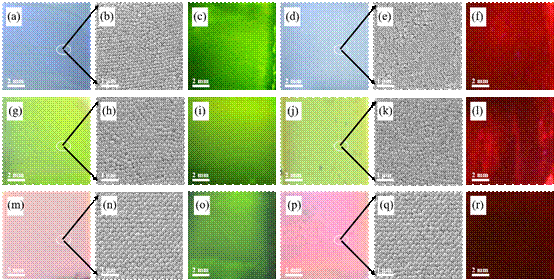 图2. 具有不同上转换荧光颜色与结构色的双模式荧光光子晶体薄膜扫描电镜照片及自然光与980 nm激光下的实物照片
