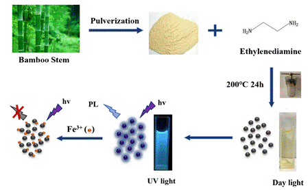 图1. 竹茎衍生氮掺杂碳量子点的制备及Fe3+检测应用