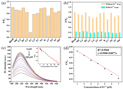 图3. NCQDs对金属离子的选择性响应测试及对不同浓度Fe3+的荧光响应测试