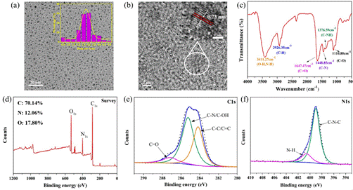 图2. NCQDs的透射电子显微镜,傅里叶红外光谱,X射线光电子能谱表征结果