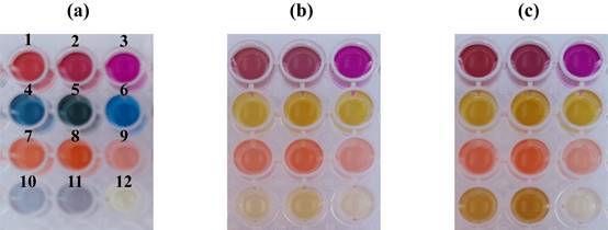 图1 比色传感器阵列与超纯水(a)、清明节前(b)后(c)六安瓜片溶液反应后的图像