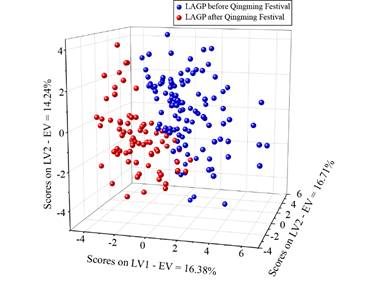 图2 训练样本的PLS-DA的前三个LVs上的得分图