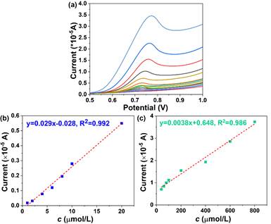 图2所示。(a) Co3O4/rGO/GCE两种浓度范围为1.0 ~ 800.0 μM的色氨酸(工作电位:0.78 V (vs. SCE电极))的典型LSVs线性关系为1.0 ~ 20.0 μM (b)和20.0 ~ 800.0 μM (c)。
