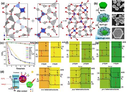 图1 (a)沿[100]方向堆叠两层相同的Ag6Si2O7晶体结构,红色、灰色、淡紫色和蓝色球分别表示O、Ag、P和Si原子(b) NaYF4@TiO2-Ag6Si2O7的制备过程示意图及相应的SEM图像。(c)所得样品在太阳光照射下的光催化活性。(d)光照射下载流子转移的光催化机理。(e) n-n异质结构,(f) p-p异质结构,(g) p-n异质结构接触前后的能级示意图。