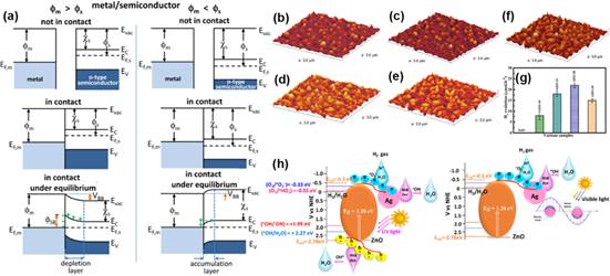 图3 (a) n型半导体与金属接触时的能级变化示意图,Evac:真空能级,Ec:导带能级,Ev:价带能级,m:金属的功函数,s:半导体的功函数,s:半导体的电子亲和势。(b-e)不同Ag加载量下(b) 10、(c) 15、(d) 20、(e) 30 s Ag/ZnO薄膜的AFM图像,(g)可见光下相应的电化学H2演化;(h) UV和可见光照射下Ag/ZnO纳米结构的电荷转移机制。