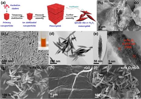 图1 (a)纳米粒子自组装形成α-Fe2O3介晶。氧化石墨烯(b)和纺锤状α-Fe2O3介晶(c)的SEM图像,(c)为分散在水中的α-Fe2O3介晶照片; α-Fe2O3介晶的TEM图(d)、单个α-Fe2O3介晶的TEM图(e)和α-Fe2O3介晶的HRTEM图(f);(g)纺锤状α-Fe2O3/GO的SEM图像;rGO (h)和α-Fe2O3/rGO (i)在GCE上的SEM图像。