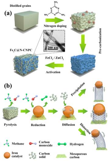 (a)三聚氰胺氮掺杂和FeCl3/ZnCl2化学活化制备Fe3C@N-CNPC过程示意图。(b)化学气相沉积催化合成不同轴向直径、长度及形貌之奈米碳管之机制。