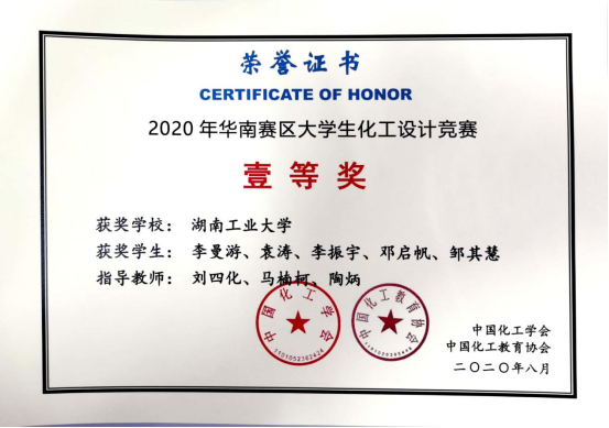 学生团队2020年华南赛区大学生化工设计竞赛获一等奖