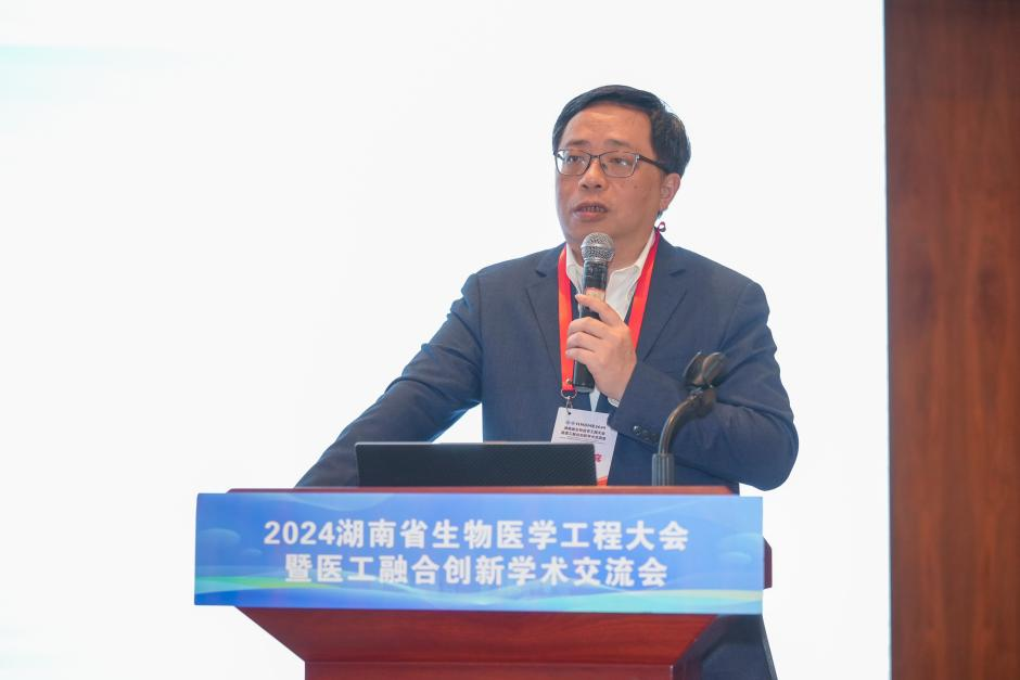 中南大学常务副校长、湘雅医学院院长、湖南省芙蓉实验室主任、芙蓉学者领军人物陈翔教授以《重要皮肤疾病代谢特征发现与诊治新体系创建》为题开启了大会报告环节,陈翔教授应大会要求首先对湖南省生物医学工程学科建设、人才培养等提出殷切希望和针对性的发展建议,他强调要深入开展学科交叉,生物医学工程一定要与临床医学密切联系,并解决临床真问题。接着,他以《重要皮肤疾病代谢新特征发现与诊疗新体系创建》为题进行了学术演讲。他以银屑病和黑素瘤为例,介绍了科研团队开展的流行病学研究、分子机制研究、转化医学研究等工作,以及围绕皮肤病在揭示病因新规律、阐明发病新机制、研发诊疗新策略、构建防控新体系等方面的进展和成效。