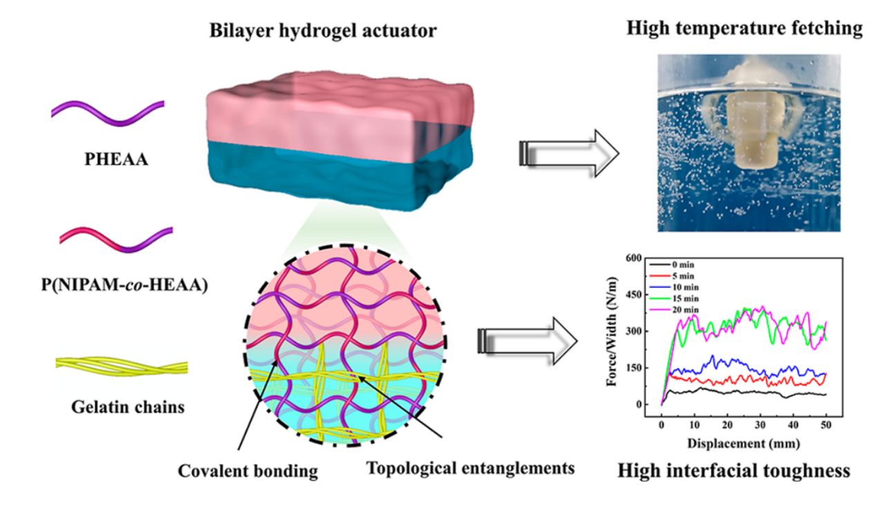 本文提出了一种同步紫外(UV)聚合策略来构建具有高界面韧性的双层水凝胶驱动器。具体地说,通过添加具有溶胶−凝胶过渡到下层预溶液的材料,在模具中获得了一个扁平的水凝胶。然后,将上层预溶液倒在下层水凝胶上,而上层预溶液通过分子扩散渗透到下层水凝胶中。此外,利用紫外光启动了上下预溶液中含乙烯基单体的同步自由基聚合。在聚合过程中,在两层界面附近产生了大量分子链之间的共价键和拓扑纠缠结构,形成了具有完美凝胶−凝胶界面和高界面韧性的双层水凝胶驱动器。这项创新的同步紫外聚合策略有望为双层水凝胶驱动器的性能提升开辟新的途径。