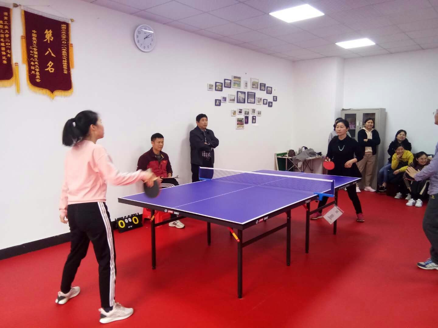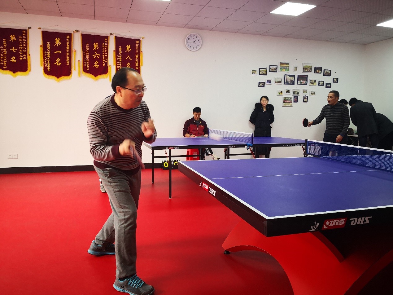 此次比赛分为初赛、复赛和决赛三场,由黄亚雄担任总裁判。在比赛开始之前,已经有不少老师提前来到活动室进行热身。下午1点,比赛正式开始,在初赛,老师们男女均分上下两半区通过抽签的方式抽取对手,两两对打,获胜的一方即可进入复赛,复赛上下半区各取前两名进入决赛,进行接下来的比拼。