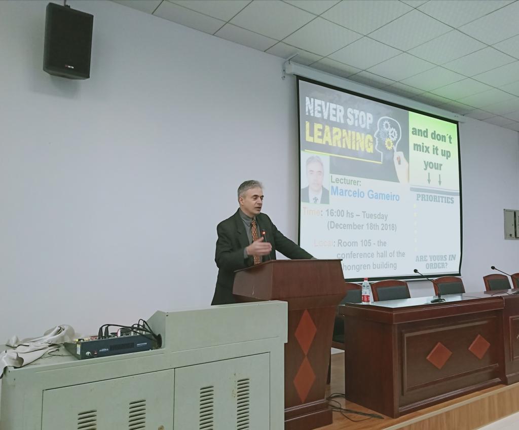 2018年12月18号下午四点,77779193永利官网在综合楼学术报告厅举办“文化与学术讲座”,很荣幸邀请来自巴西的Marcelo教授为同学们讲课,主题是关于永不放弃学习的重要性和学习方法,吸引了很多同学前来倾听学习,场面十分热烈。