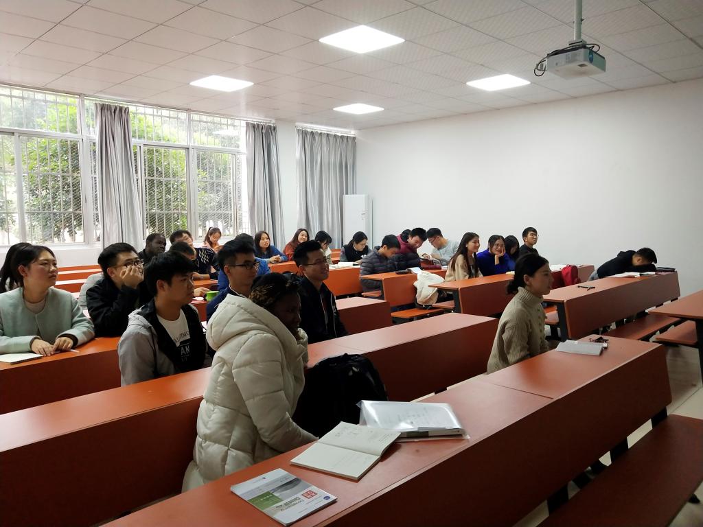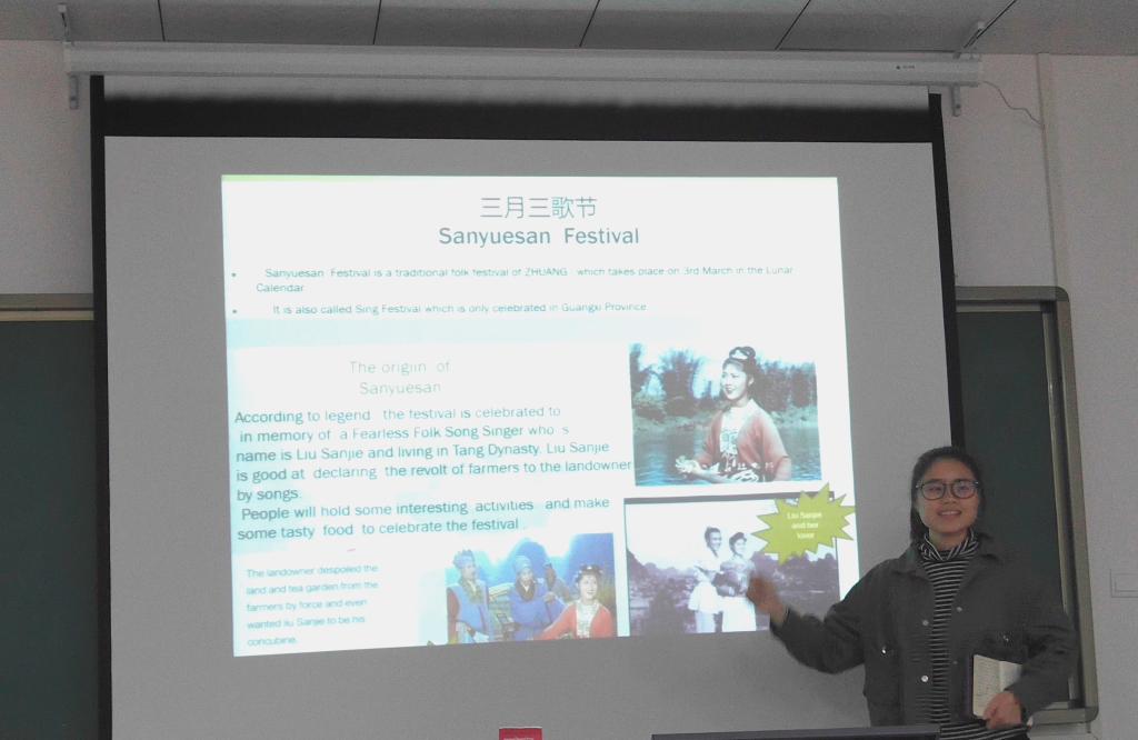 在英语角上,同学们根据事先准备好的材料,以全英文的方式向在座的同学介绍自己国家的传统文化、家乡特色、美食等等。介绍的方式是多样的,有通过bbc的视频介绍春节,也有通过ppt的形式介绍了伟大的军事家屈原、筷子的起源、湖南邵阳的特色等等,在演讲期间,同学们都聚精会神地听着,留学生也会提出自己的一些想法和疑问。