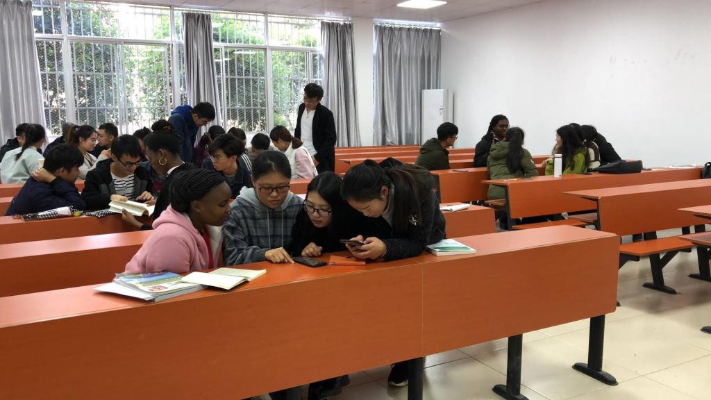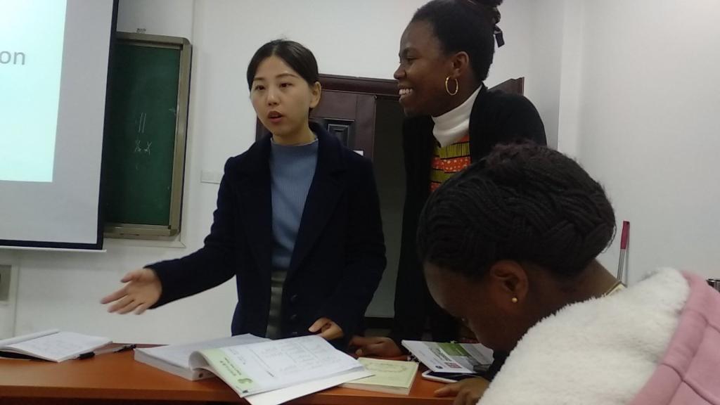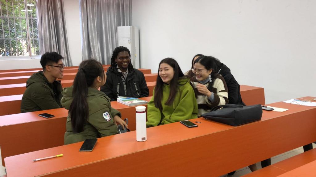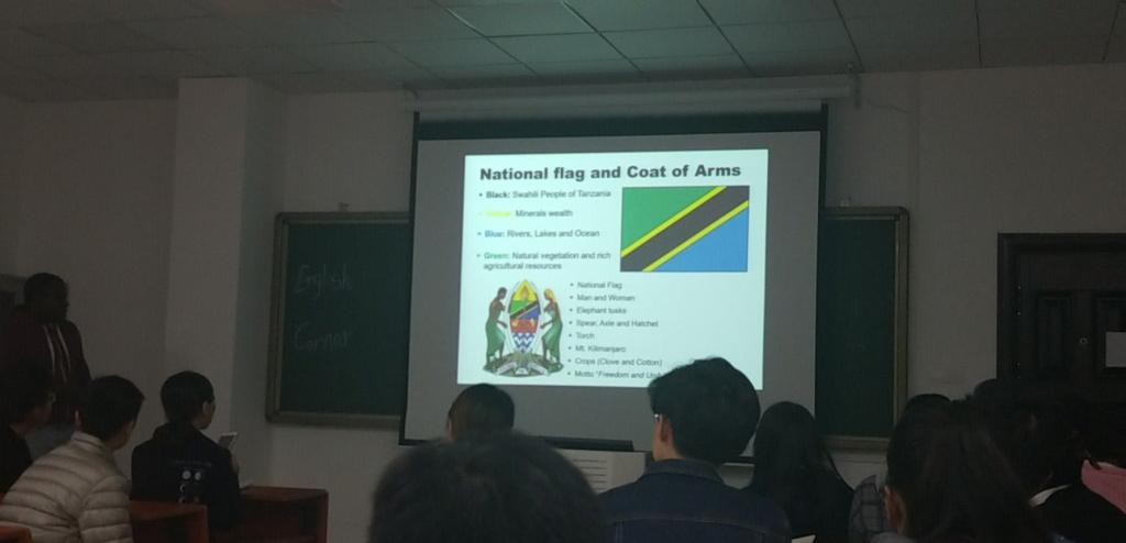 在她们互相交流时,李青老师悉心地为同学们解答疑惑,这不仅仅是一次中外学生的互相交流,更是文化的碰撞,中国学生和坦桑尼亚的留学生积极讨论,交流融洽。其中,留学生Zuberi提前准备好PPT,为我们展示了坦桑尼亚这个国家的饮食、货币、著名景物等历史文化,让我们对坦桑尼亚这个美丽的非洲国度有了很多的了解。最后是自由交流环节,本科生研究生以及坦桑尼亚的留学生自由交流,以促进大家的了解对方的兴趣爱好和生活习惯;据了解,其中两位有着脏辫的留学生说这是代表着一种文化信仰。同学们对于下次英语角都十分地期待。