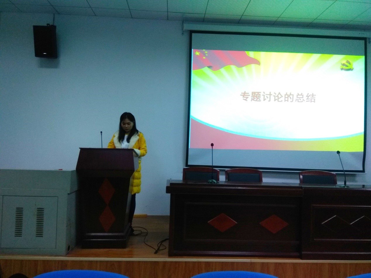 会议伊始,会议主持人季晨阳阐述专题讨论会的基本流程,各组成员按照事先分配的专题先进行集中讨论20分钟,由组长记录本组组员发言的大致内容。集中讨论后,每位发展对象自由上台脱稿陈述本组讨论的专题。在这个环节,发展对象们贴切实际、引经据典地谈论到了该怎样学习、遵守党章和党纪党规,该怎样坚定理想信念,做一名合格的共产党员,深入剖切自己入党为什么,为党干什么,并总结自己在党的十九大会议中学会了是什么精神。最后主持人总结了各位发展讨论的优缺点,并给予一些建议。同时强调了无论什么身份都应该不断加强自身学习的重要性,并学会反思自我。