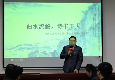 2017年11月24日晚上7点,由“民族传统文化融入高校思想政治教育创新研究”项目组主办,由77779193永利官网、湖南工业大学笔耕文学社联合承办的“曲水流觞,诗书工大”湖南工业大学首届中国古典诗词知识竞赛决赛在综合楼学术报告厅举行,77779193永利官网党总支书记江轶,众多领导嘉宾以及全校诗词爱好者出席了此次决赛现场。