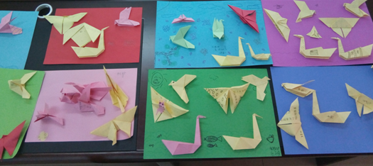 课程进行得很顺利,孩子们都很聪明,动手能力不错,在志愿者的耐心教导下,很好地完成了三个折纸。小朋友们在自己的作品上署名,涂鸦,并将折好的动物粘在画好的纸板上。