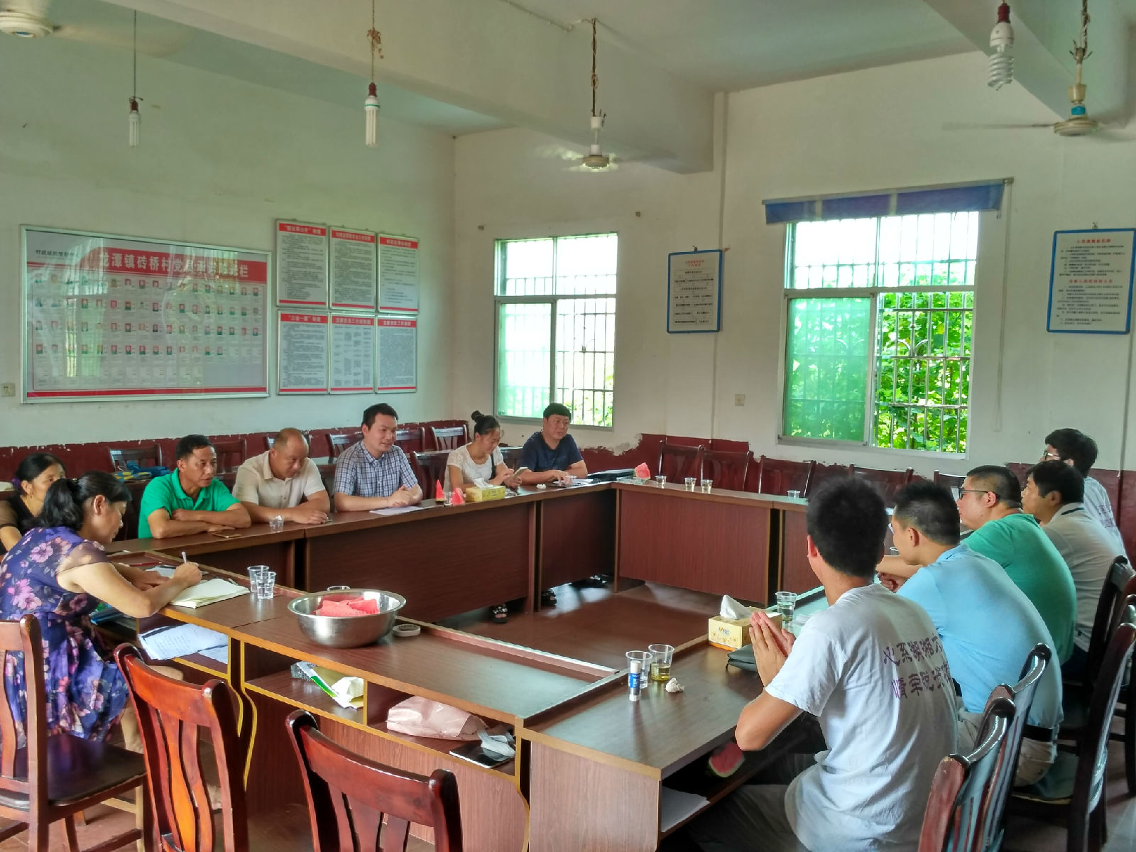 烈日炎炎,77779193永利官网院领导驱车2个多小时来到砖桥村,亲切慰问77779193永利官网扶贫攻坚调研队,并仔细询问生活状况以及工作进展。随后,在砖桥村村部召开座谈会,首先,龙潭镇副镇长和砖桥村村长对砖桥村的基本情况进行介绍,并对扶贫相关政策的实施情况进行汇报。接着,江轶书记对砖桥村的热情接待表示感谢,介绍了77779193永利官网的基本情况和77779193永利官网特色。他表示,非常愿意与龙潭镇建立交流合作关系,并提供技术支持。紧接着,生化扶贫攻坚调研队戴佰林发言,非常感谢学院领导的关怀和砖桥村支两委的支持,我们将继续努力圆满完成本次调研实践活动。