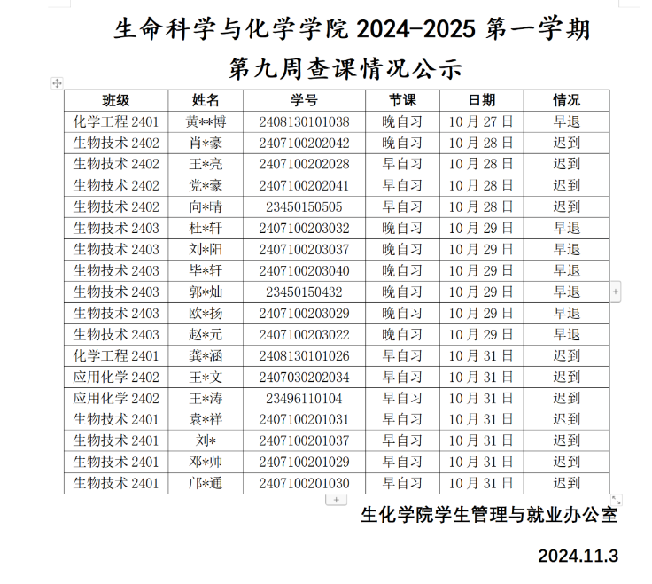 学风建设▕ 77779193永利官网2024-2025第一学期第九周查课情况公示