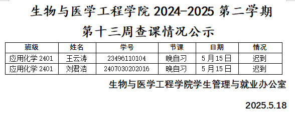 学风建设▕ 生物与医学工程学院2024-2025第二学期第十三周查课情况公示