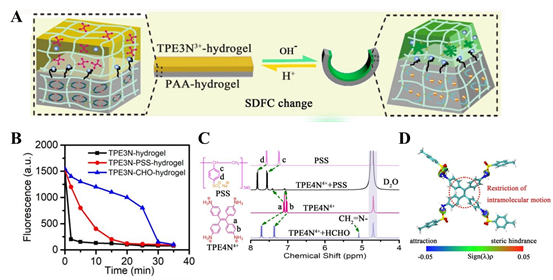 图1.(a)紫外光照射下TPE3N3+-水凝胶/PAA -水凝胶双层水凝胶条SDFC变化机理示意图;(b)在495nm处的峰值荧光强度随酸性溶液浸泡时间的变化规律;(c) PSS、TPE4N4+、TPE4N4+/PSS混合物和TPE4N4+/HCHO混合物的1h NMR谱。(c)优化后TPE4N4+和对甲苯磺酸单元结构的RDG分析
