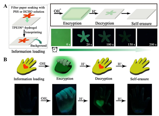 作者利用电静力作用和动态共价键在荧光水凝胶层上实现了荧光信息的离子印刷编码。基于AIE-Active TPE3N3+水凝胶的PH响应性荧光性能,首次构建了时间相关的二维信息加密平台(图2A)。并且由于衰落速率的动态特性不同,存储的信息可以在不同的时间被解密,从而实现具有自擦行为的多级加密(图2B)。