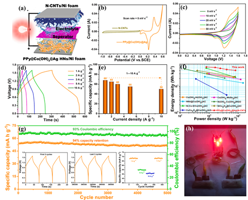 图4.(a)在5 mV s−1下扫描PPy@Co(OH)2 @Ag和(b)N-CNTs电极的CV曲线; CV曲线、(d)GCD曲线、(e)倍率容量、(f)Ragone图、(g)HSC器件循环性能; (h)由两个连接的HSC器件点亮的九个橙色指示灯的照片。图10g中的插图是前三个和最后三个周期的GCD曲线以及不同电流密度下的速率稳定性。