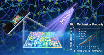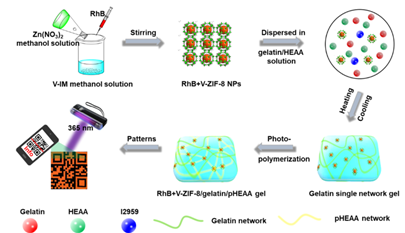 研究人员通过使用一个简单的一锅法设计和制造了MOF NP交联的明胶/pHEAA纳米复合双网络水凝胶。在水凝胶中存在乙烯基官能化沸石咪唑骨架-8 MOF NPs不仅提供了与聚合物网络的多种化学和物理相互作用以增强其机械性能,(抗拉强度为2.4 MPa,断裂应变为14,断裂能为14.10 MJ/m3),而且紫外线触发的多荧光变化范围从原色红-绿色-蓝色到二级黄色、洋红、青色、和白色颜色。更重要的是,可以进一步制造MOF/明胶/pHEAA水凝胶以具有用于QR码或潜在信息存储的不同的荧光响应图案。