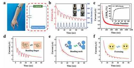 研究人员采用聚乙烯醇(PVA)、氯化钠(NaCl)和N-羟乙基丙烯酰胺(HEAA) 合成了具有优异机械性能 (拉伸应力/应变 3.76 MPa/872.15%)、高离子电导率(1.3 S /m 的完全物理交联双网络水凝胶 PNH DN 水凝胶)和快速自恢复(休息 10 min 后能量耗散/峰值应力恢复效率为 57.08%/99.06%)。基于 PNH DN 水凝胶,分别制备了水凝胶应变传感器和柔性固态超级电容器。基于 PNH DN 水凝胶的水凝胶应变传感器具有良好的灵敏度 (标距系数 = 1.74)、检测范围宽 (0–735%) 和可忽略不计的响应延迟时间 (0.06 s),有助于及时可靠地检测各种机械变形。同时,基于 PNH DN 水凝胶的超级电容器的面电容为 2.9 mF•m-2,高循环稳定性(在 0.5 mA•cm-2 的电流密度下进行 2000 次恒流充放电循环后,面电容保持率为 85.71%)和机械稳定性(循环伏安曲线在 0°、45°、90°、135° 和 180° 弯曲下几乎重叠)。最后,将水凝胶应变传感器和超级电容器集成到一个自供电的柔性传感系统中,该系统可以稳定有效地检测人体运动,如手指弯曲、颈部弯曲和皱眉。