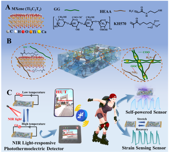 以Ca2+交联结冷胶(GG-Ca2+)为第一网络,聚(N-羟乙基丙烯酰胺)(PHEAA)为第二网络,3-(三甲氧基硅基)丙基甲基丙烯酸酯(KH570)修饰的MXene(K-MXene)纳米片为交联剂和功能性纳米填料,成功制备了一种具有高强韧、抗冻性和光-热-电响应性的电子/离子复合水凝胶(KMGHCa)。该水凝胶的多功能性主要源于MXene和Ca2+之间的协同作用。一方面,MXene既作为光热剂,在近红外光(NIR)照射下表现出优异的光热特性,又充当凝胶网络交联剂和导电填料的角色。另一方面,引入Ca2+进一步增强了水凝胶的机械强度、导电性和抗冻性。此外,生物相容性良好的多糖结冷胶(GG)在低浓度下即可快速凝胶化,而且其分子链中含有羧酸基团,能与Ca2+特异性结合形成Ca2+-COO-金属配位,促进GG的凝胶化。PHEAA具备柔韧性和弹性,PHEAA与GG之间的氢键作用,增强了水凝胶中聚合物链的缠结效应,赋予了水凝胶优异的机械性能。该多功能水凝胶在应变传感器、摩擦纳米发电机及近红外光-温度光热电探测器等领域具有广阔的应用前景。