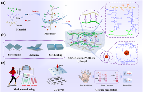 开发一种既具有高机械强度和优异自愈合特性,又能够保持高导电性和强粘附性能的双网络导电水凝胶,同时确保这种水凝胶能够在各种环境条件下稳定工作,并将其有效集成到可穿戴传感器中,以实现对人体生理信号的灵敏监测和准确手势识别,这涉及到复杂的材料设计、精细的化学合成、以及对传感器性能的优化和机器学习算法的高效应用。研究团队采取了两步法的策略来制备这种水凝胶:首先合成OSA,然后通过席夫碱反应形成大的交联剂,最后在Ca2+的存在下通过热聚合形成所需的双网络导电水凝胶。该工作利用氧化海藻酸钠(OSA)作为桥梁,通过席夫碱反应将明胶和聚丙烯酰胺网络结合起来,形成了一种具有多种相互作用的双网络结构。这种结构赋予了水凝胶前所未有的机械强度和自愈合特性,同时保持了高导电性,拉伸应变达到2800%,应力达到630 kPa,导电性达到0.72 S/m。此外,该水凝胶还展现出了快速响应和高灵敏度的传感能力,能够监测广泛的人体生理信号,包括压力传感和手势识别,展示了其在健康监测、人机交互和人工智能领域的应用潜力。