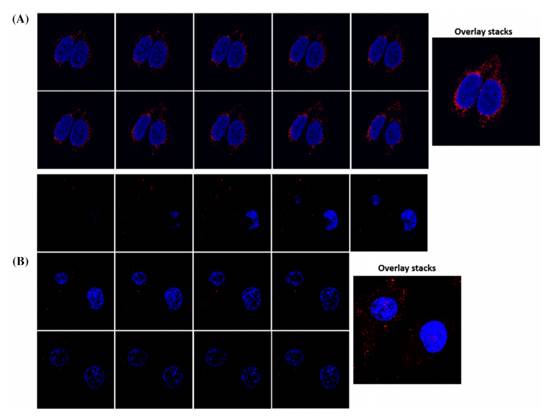 图4 目标 miRNA-21 在 HeLa 细胞(A)和 HEK-293 细胞(B)中的 Z 叠分析