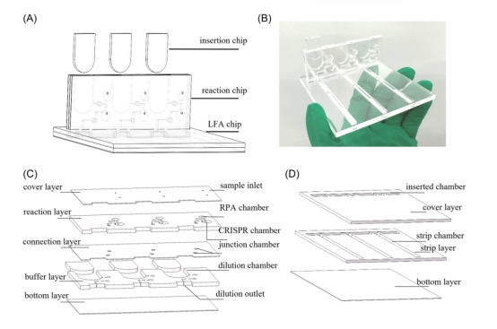 图4 手动微流控芯片设计示意图。(A) 芯片外观; (B) 制造后的芯片实物;(C) 反应芯片细节;(D) LFA芯片细节。