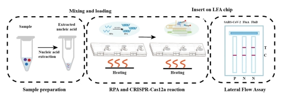 实时荧光定量PCR(qPCR)是当前病原体检测的金标准,但其依赖专业人员和精密设备,耗时较长,难以满足即时检测需求。本研究开发了一种基于RPA和CRISPR-Cas12a技术的新型检测方法,用于鉴别引起类似流感症状的三种病毒病原体:SARS-CoV-2、甲型流感和乙型流感,并进一步整合微流控芯片与侧向层析试纸条(LFA),实现多场景应用(图1)。