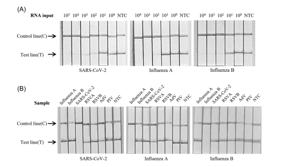本研究首次提出了一种基于RPA/CRISPR-Cas12a的微流控侧流层析检测方法,成功用于SARS-CoV-2、甲型流感和乙型流感的检测。 该方法具有简单灵活性,检测快速灵敏,且人工操作的微流控芯片适用于现场及资源有限地区,无需笨重昂贵设备,为即时诊断提供了有力工具。