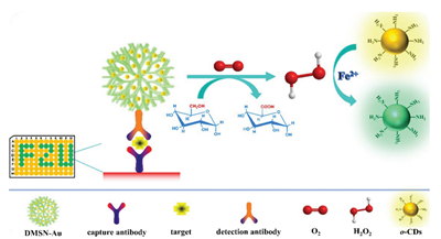 CDs因其成本低、稳定性好、毒性低而被用于生物分子检测的生物传感器。据报道,杂原子掺杂CDs能够增强其光荧光和扩展了其应用。Zhang等设计了一种荧光免疫传感器。以苯二胺为前驱体,合成了荧光发射波长可切换的o-CDs。然后将氨基修饰的树突状介孔二氧化硅纳米颗粒(DMSN)与AuNPs共轭形成DMSN-AuNPs复合材料。用该复合材料作为纳米酶水解葡萄糖,生成过氧化氢。o-CDs的荧光被亚铁离子有效猝灭,而过氧化氢的存在恢复了荧光(图2)。
