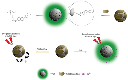 值得注意的是,双光子荧光的抗stokes荧光避免了来自生物物种的自身荧光或背景荧光,以提供灵敏和高分辨率的生物成像或生物传感。Zhang等人的研究小组报道了一种基于双光子荧光染料的探针,用于细胞和组织中的硫化氢检测和成像。为了克服有机荧光染料所固有的缺陷,该小组随后将染料掺杂到二氧化硅纳米颗粒中,形成低毒、水溶性好的复合发光硅材料,成功用于体内检测抗坏血酸(AA),如图1所示。在该纳米体系中,双光子染料在硅纳米颗粒表面形成带负电荷的双光子纳米颗粒(TPNPs),然后通过静电吸附结合氢氧氢氧化钴纳米片,由于电子转移(ET)的影响,双光子纳米颗粒的荧光显著降低。当加入AA,将CoOOH还原为Co2+,导致Co-OOH纳米片解体,TPNPs的荧光恢复。该纳米系统检测AA的LOD值达到170 nM。