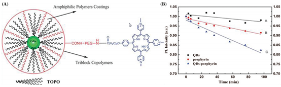 图3 (A)CdSe/ZnS量子点结合水溶性卟啉的示意图。(B)9,10-蒽二丙酸(ADPA)在PBS缓冲液中QD、卟啉和QD卟啉存在下随时间的荧光强度曲线。