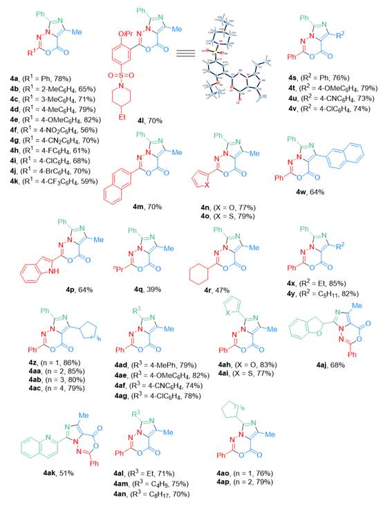 咪唑作为一类重要的结构单元,广泛存在于天然产物、材料科学以及具有生物活性的化合物中,如抗炎、抗菌和抗HIV衍生物。特别是4H-咪唑[1,5-d][1,3,4]恶二嗪-4-酮稠合体系表现出多样的生物活性。然而,这些化合物的化学性质仍有许多值得探索的方面,开发新型4H-咪唑[1,5-d][1,3,4]恶二嗪-4-酮稠合体系对推动药物发现具有重要意义。